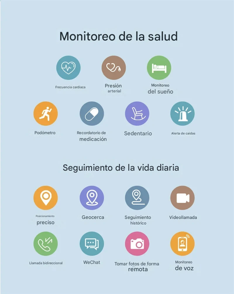 El reloj también incluye sensor de caídas con alerta instantánea, botón SOS, videollamadas y la opción de configurar zonas seguras para mayor tranquilidad.